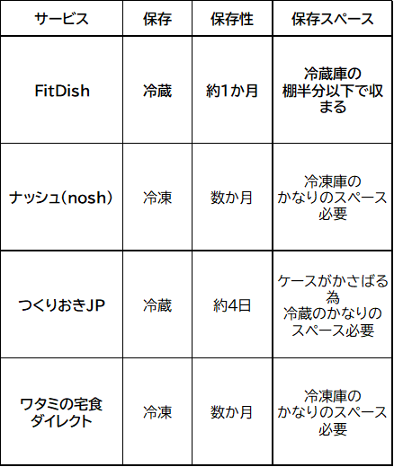 ↓主要宅食サービスの保存期間と保存スペース